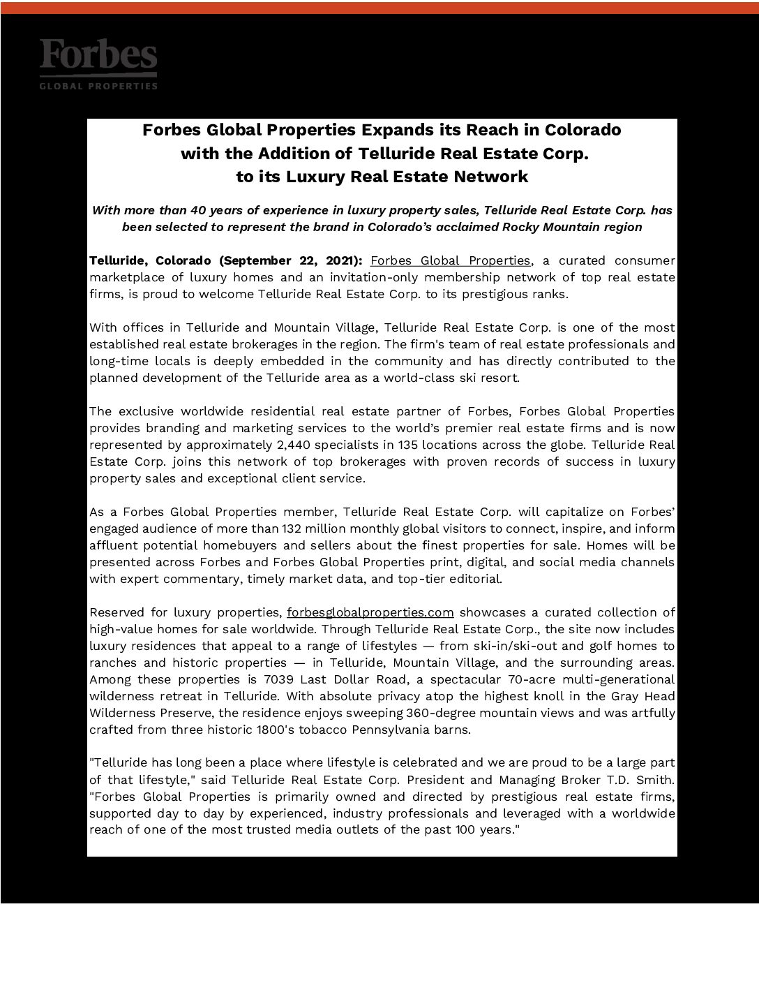 Forbes Global Properties Welcomes New Member_Telluride Real Estate Corp